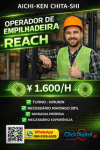 Operador de Empilhadeira Reach . Centro Logístico de Autopeças . Chita-shi, Aichi-Ken . ¥ 1.600/h . Cód. da Vaga : KA -007 .