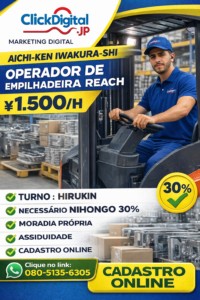 Operador de Empilhadeira Reach –Armazenamento e Expedição de Peças e Produtos para Eletrodomésticos a Gás Iwakura-shi , Aichi-Ken ¥ 1.500/h . Cód. da Vaga : KA-140 .