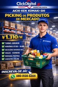 Picking – Centro Logístico de Produtos Para Mercados Komaki-shi, Aichi-Ken . ¥ 1.310/h . Cód. da Vaga TA-283 .